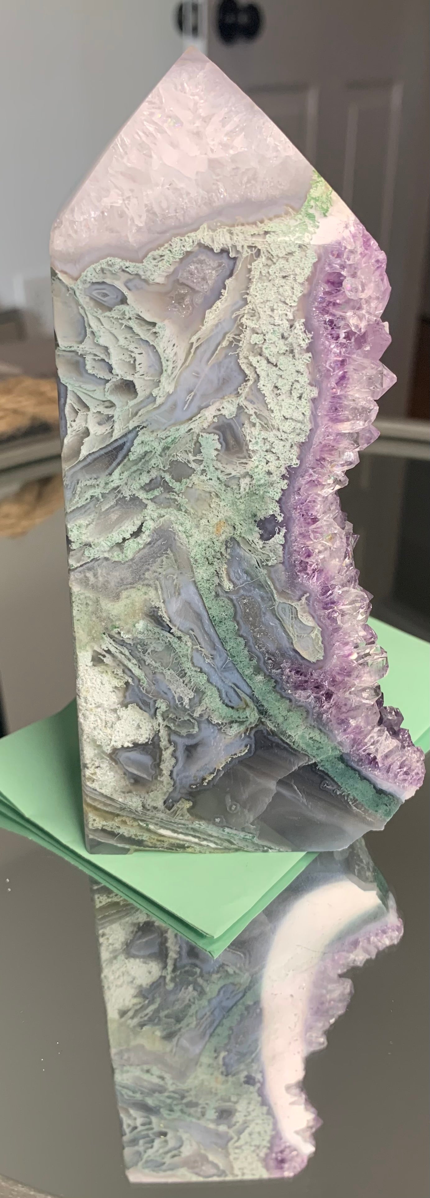 One of three beautiful towers are a rare mixture of moss agate and amethyst that I have only seen a couple times on the market. All towers have the purple amethyst stone somewhere on them with various shades of moss from traditional green to blue.
